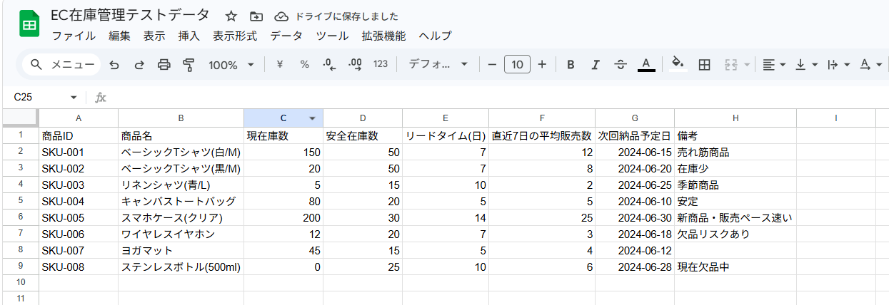 今回は例として以下の在庫表からデータを取得していきます。