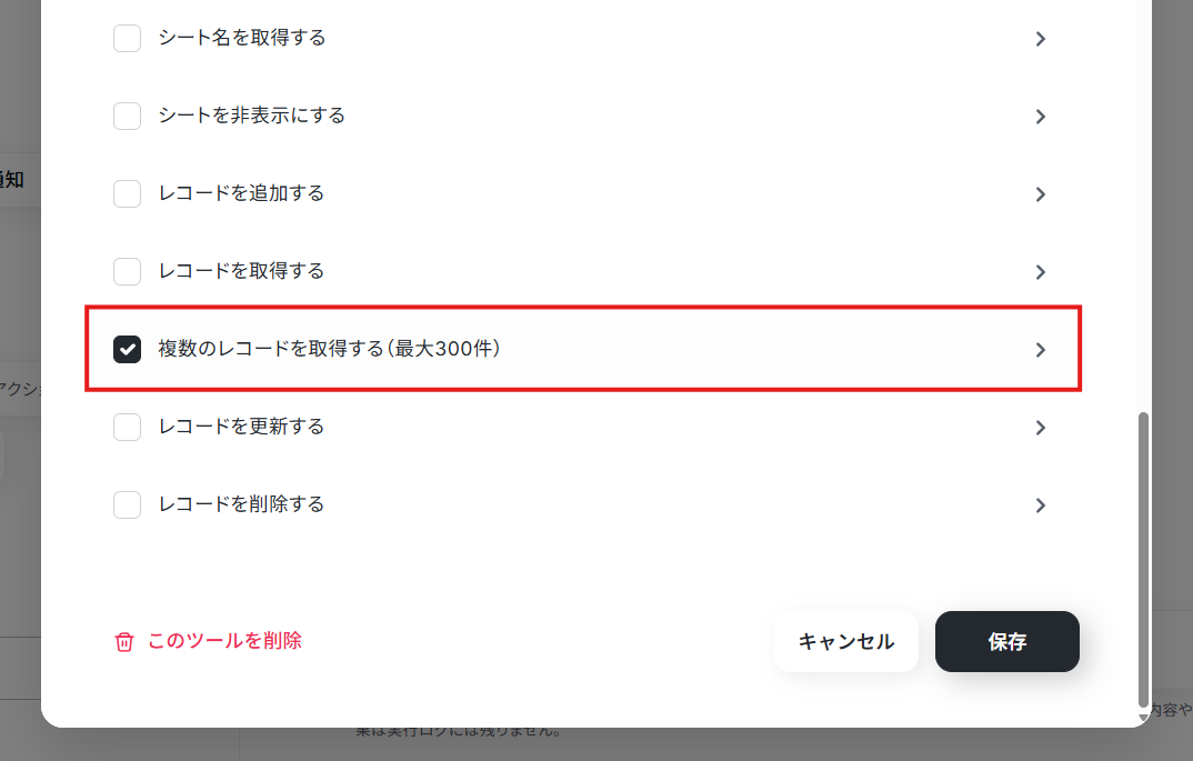 今回はGoogle スプレッドシートから在庫データを取得するため、「複数のレコードを取得する」にチェックを入れて、項目をクリックします。