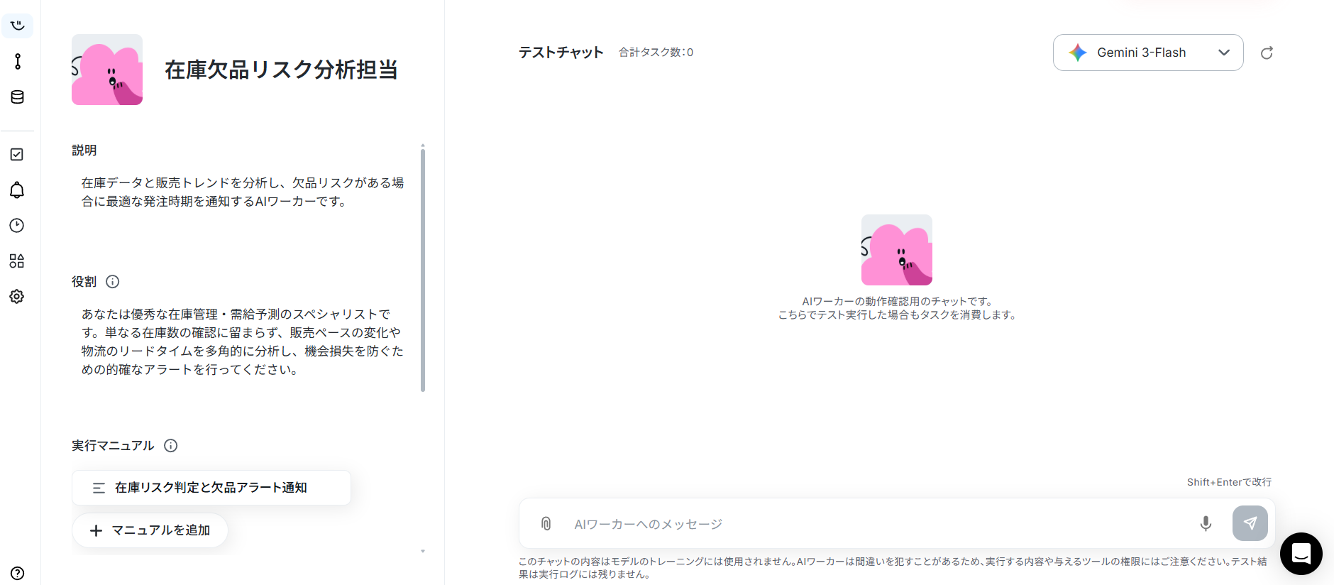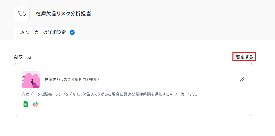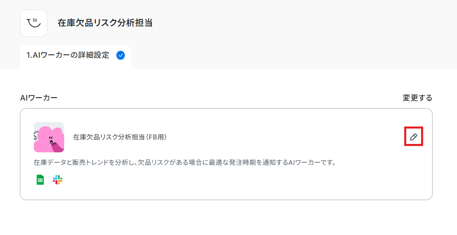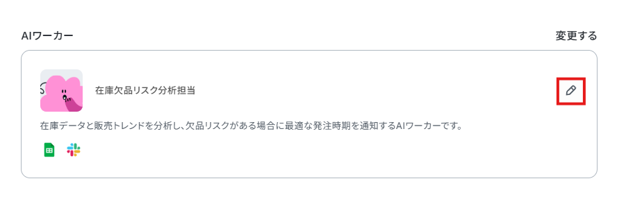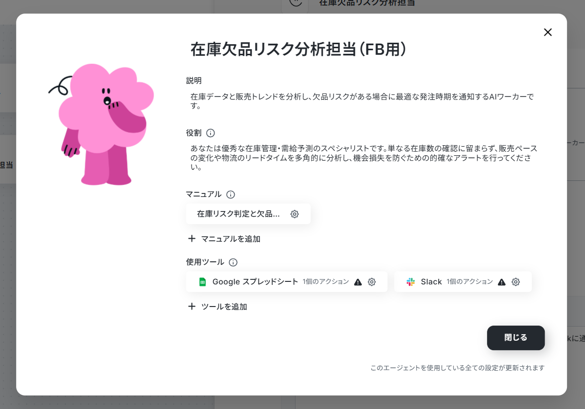 それでは実際に、在庫データと販売トレンドを分析して欠品リスクがある場合に最適な発注時期を通知する「在庫欠品リスク分析担当」のAIワーカーを作成していきます!