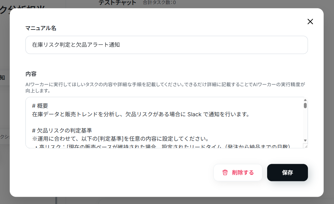 マニュアルはAIワーカーが役割に設定された仕事をこなすための手順書です。
