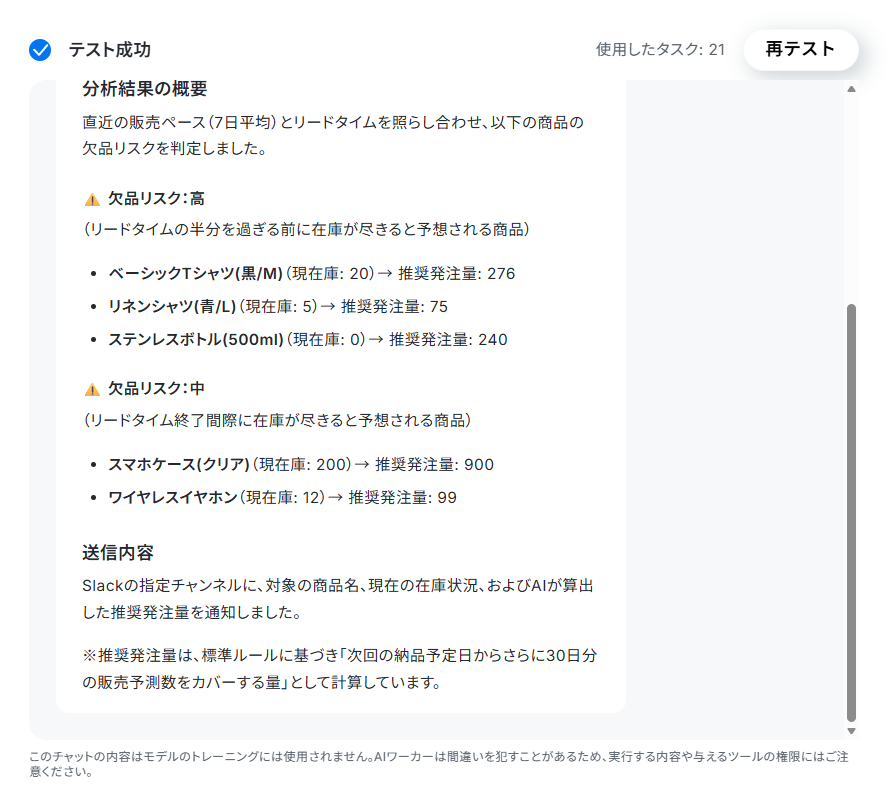 これでkintoneアプリから在庫データを取得してアラート通知を行うAIワーカーになりました!