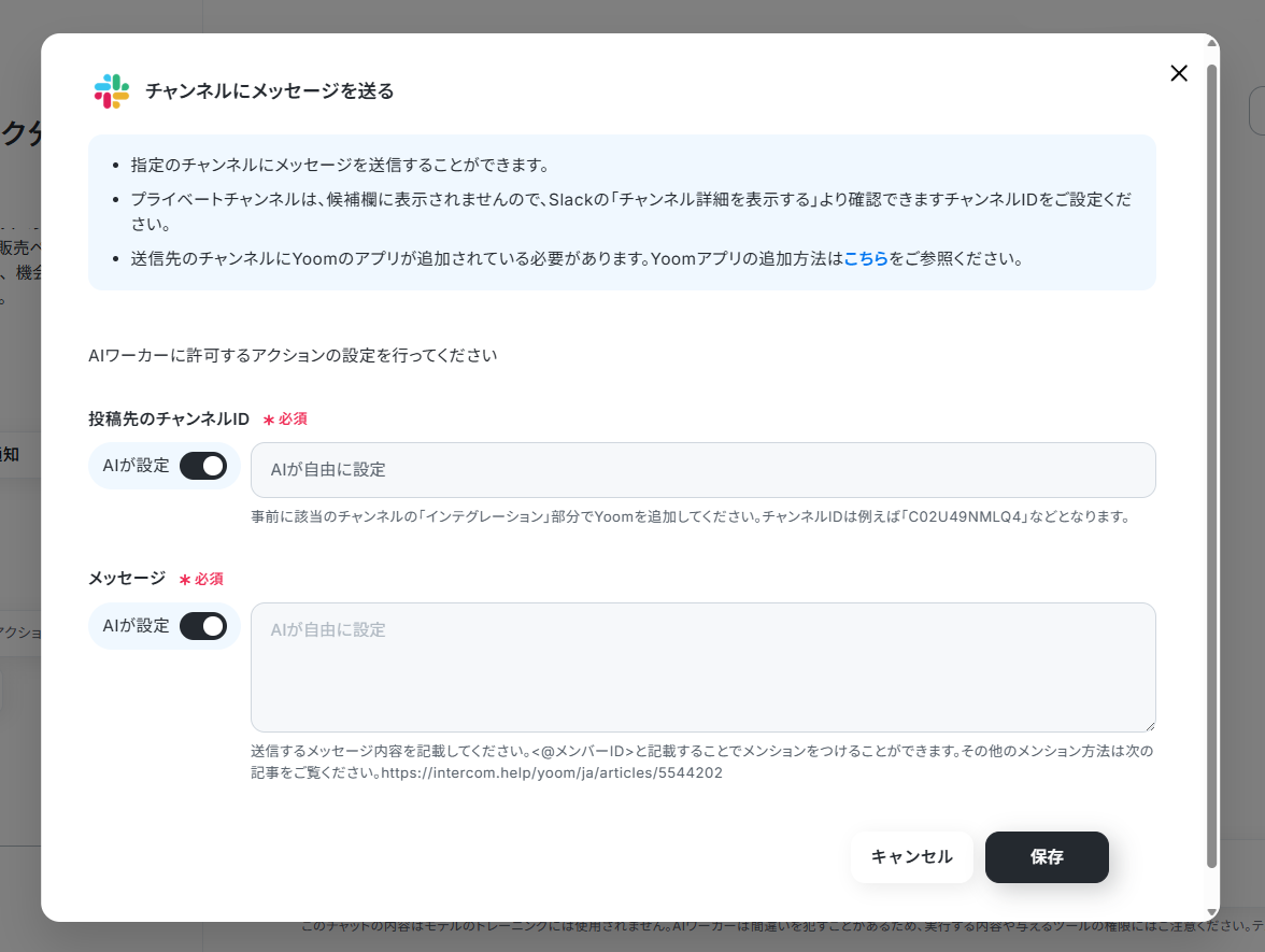 ※ AIワーカー設定時のテストでチャットに送信したような内容をイメージしてください。