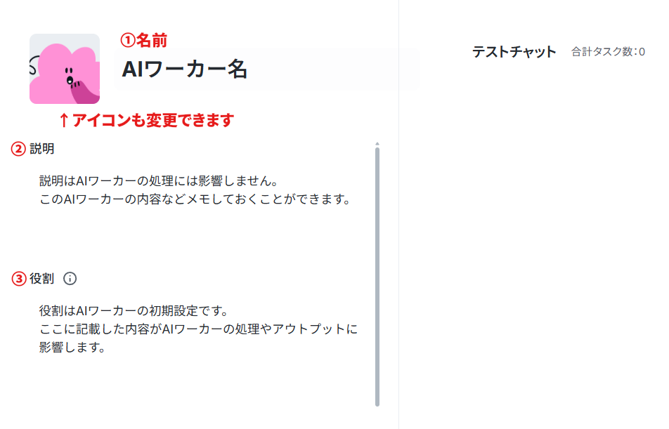 ② 説明:このAIワーカーの内容などをメモしておけます。AIワーカーの処理には影響しません。