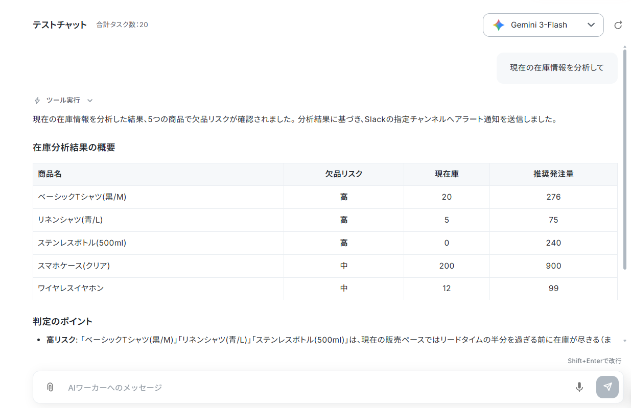 最後に、チャット上で「現在の在庫情報を分析して」などの指示を送ってみましょう。