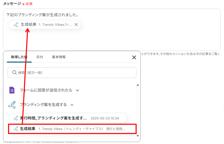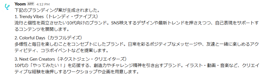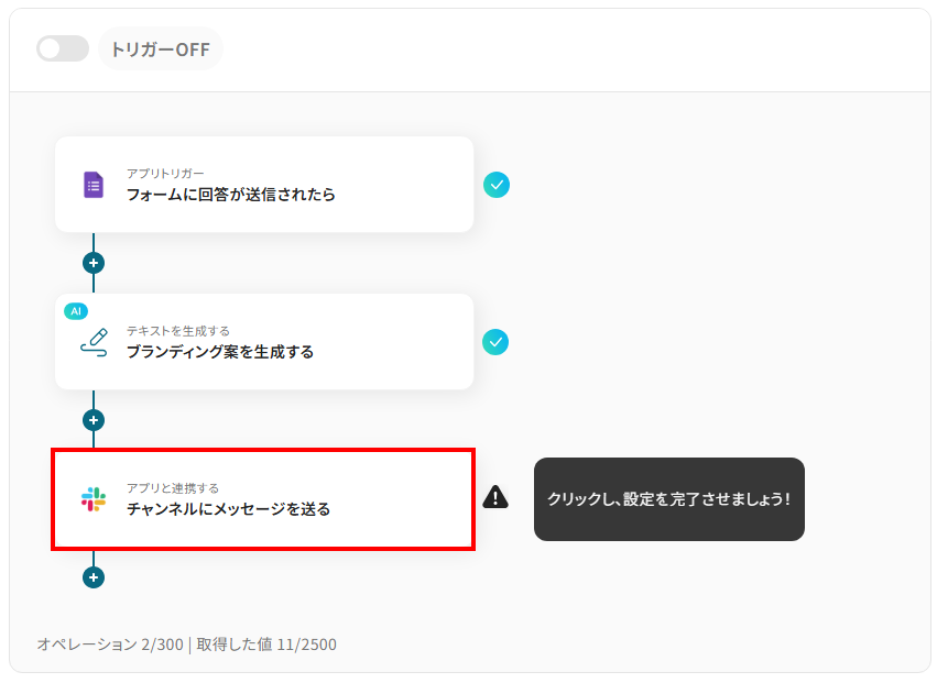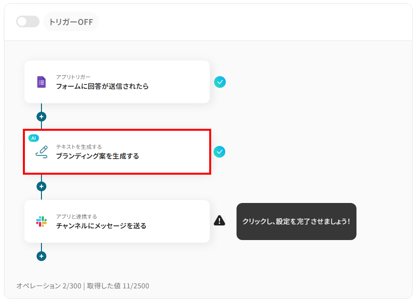 Googleフォームなどのフォームサービスに寄せられた回答内容をトリガーとして、AIが自動でブランディング戦略やアイデアを生成し、Slackなどのチャットツールに通知する ことができるので、アンケート結果や顧客からのフィードバックを基にしたブランディングのヒントを迅速に獲得し、チーム内で即座に共有するプロセスを自動化できます!