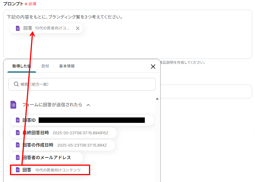 3.ここでは、テキストを作成するために、AIへの具体的な指示を設定しましょう。 プロンプト入力欄をクリックすると、下記のようにアウトプットが表示されます。Googleフォームの回答を活用して、AIへの指示を入力してください。