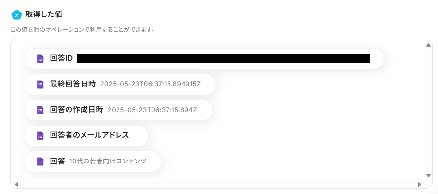 入力が完了したら、「テスト」を実行してみてください。成功すれば、下部にアウトプットが表示されます。 Googleフォームで送信した内容がきちんと反映されていれば問題ありません! ※Googleフォームをトリガーに設定した場合の回答データの取得方法については、こちら を参考にしてみてくださいね。 最後に、「保存する」を押して次のステップへ進みましょう。