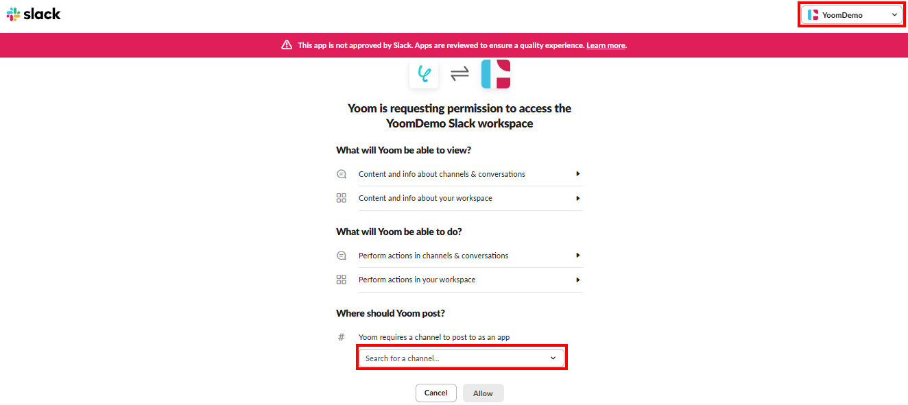 2.連携を許可する YoomとSlackとの連携を行います。下記設定を行った後、「Allow」をクリックします。