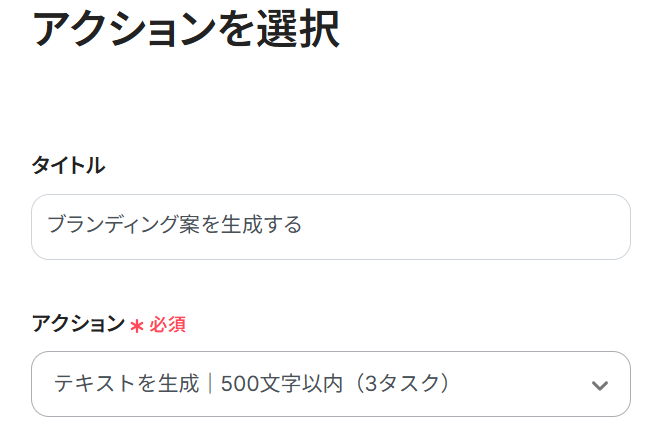 タイトルは自由に変更できますので、お好みのタイトルに設定してください。 アクションは、デフォルトで「テキストを生成|500文字以内(3タスク)」が選択されていますが、他のアクションに変更することも可能です。ただし、()内に記載されている消費タスク数を確認してから選んでください。 設定が完了したら、「次へ」をクリックして次のステップに進んでください。