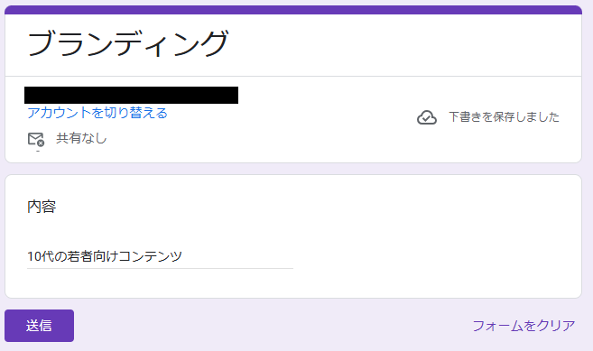 3.ここでは、トリガーとして使用するGoogleフォームの設定を行います。 もしまだ対象のGoogleフォームを作成していない場合は、このタイミングで作成してください。 今回は、下記のようなGoogleフォームを準備しました。 また、この後のテスト操作で、実際にフォームから回答を送信する必要があるため、忘れずに回答を入力しておいてください。