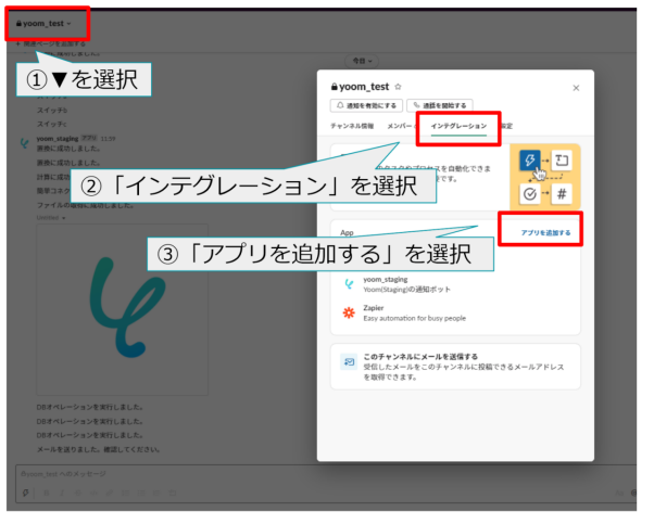 3.チャンネルにYoomアプリを追加する Slackサービス上で、Yoomからメッセージを送信するSlackチャンネルを開き、下記の図のとおり、1〜3の順に設定を行います。 ※管理者による承認が必要な場合があります。詳しくはこちらの公式ヘルプ をご参照ください。
