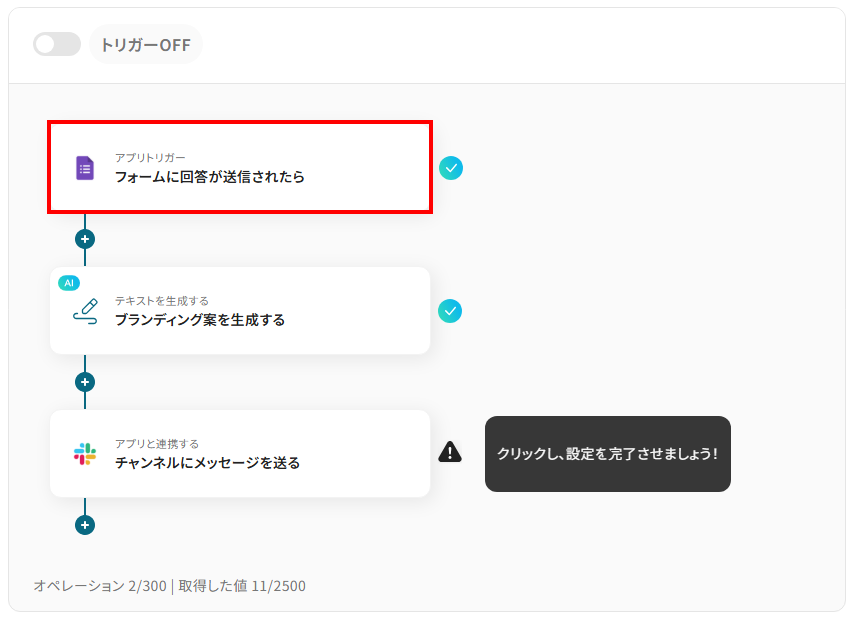 それではここから代表的な例として、Googleフォームに新しい回答が送信された際に、その内容をもとにAIがブランディング案を自動で生成し、Slackに通知するフローを解説していきます!