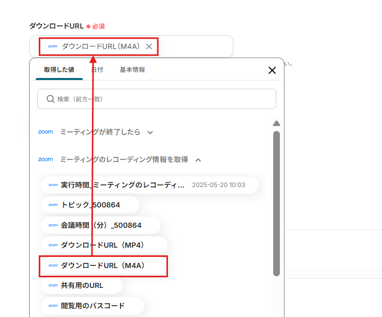 ミーティングのレコーディング情報を取得の「ダウンロードURL(M4A)」を選びましょう。