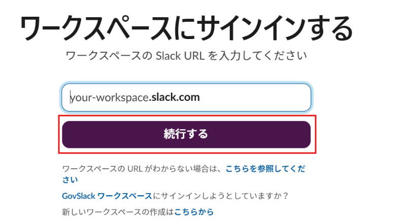 以下の画面が出てきたら、使用したいワークスペースのアドレスを入力して、「続行する」をクリックして次に進みましょう。