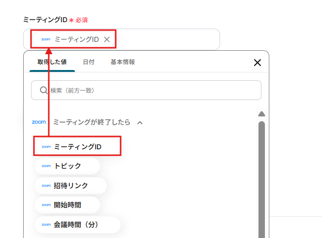 ミーティングIDは先程の取得した値を選択します。