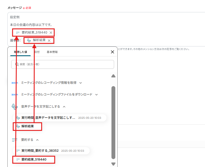 会議内容の要約と議事録は、取得した値から入力しました。