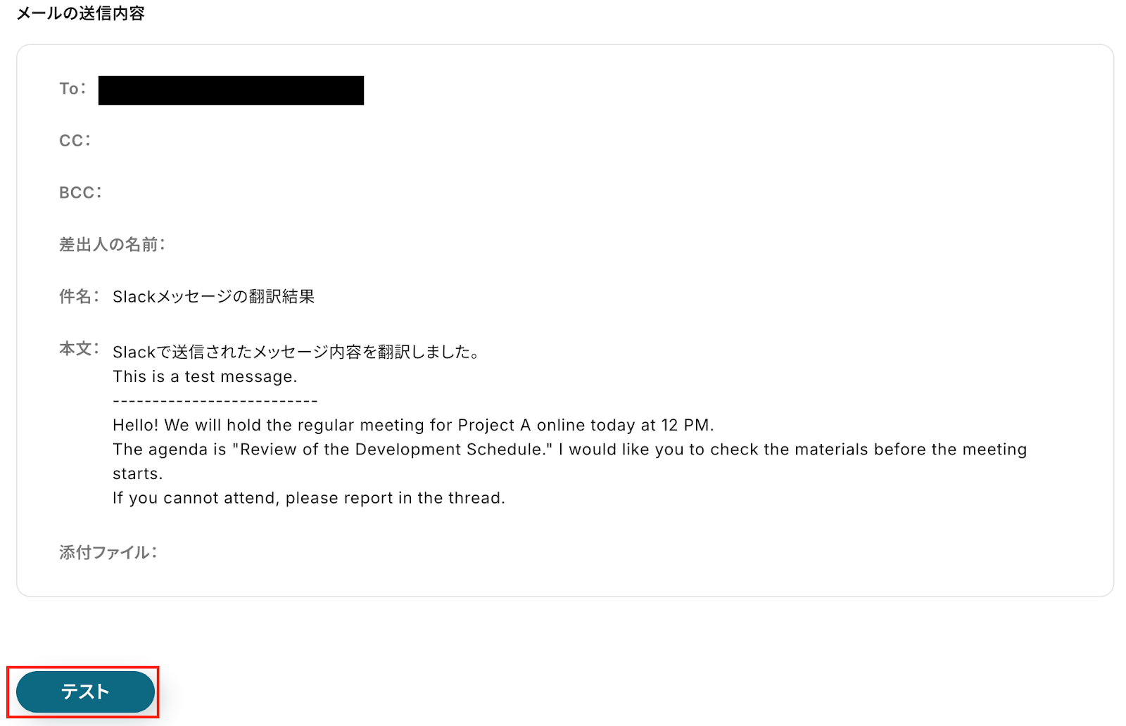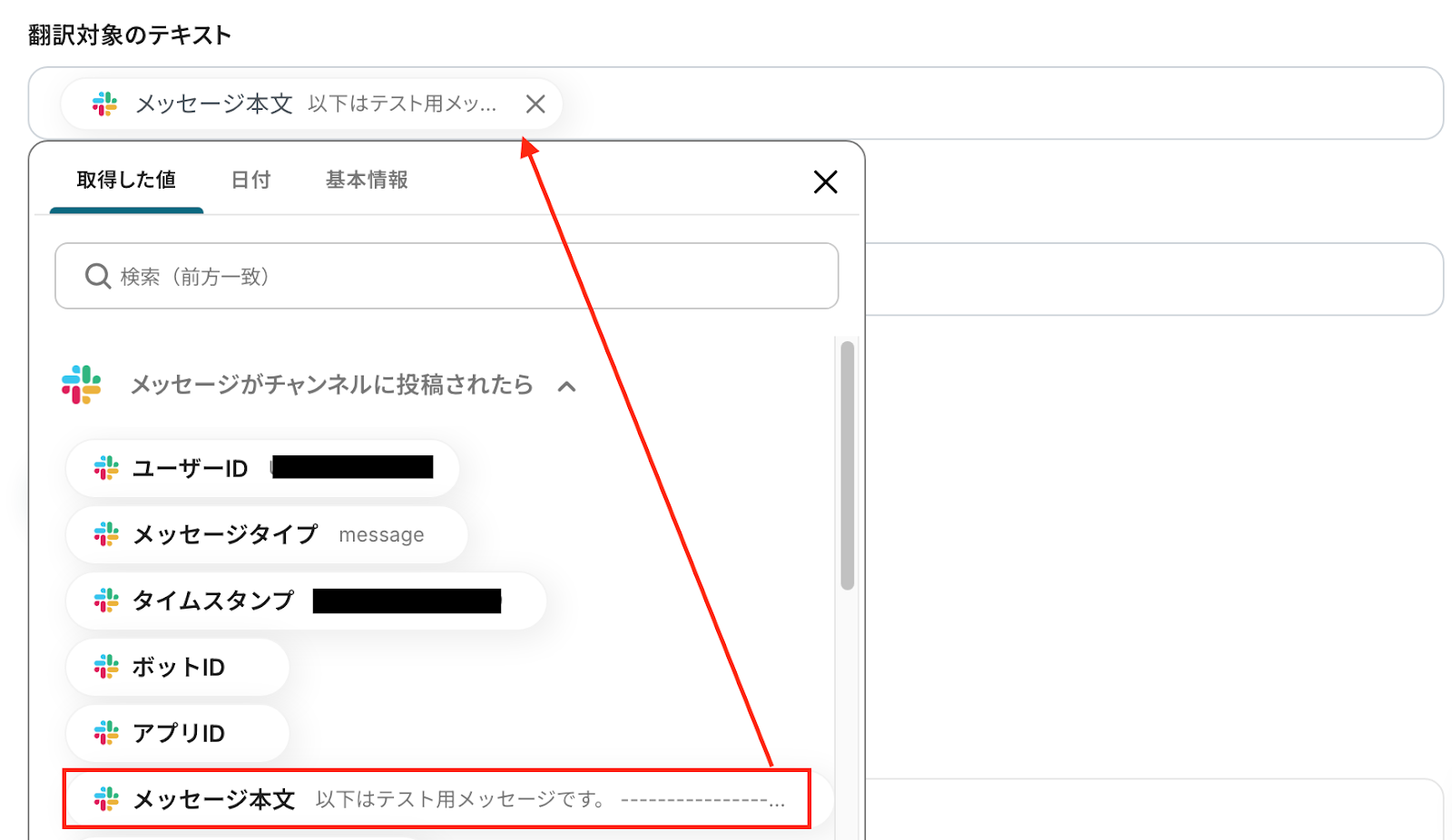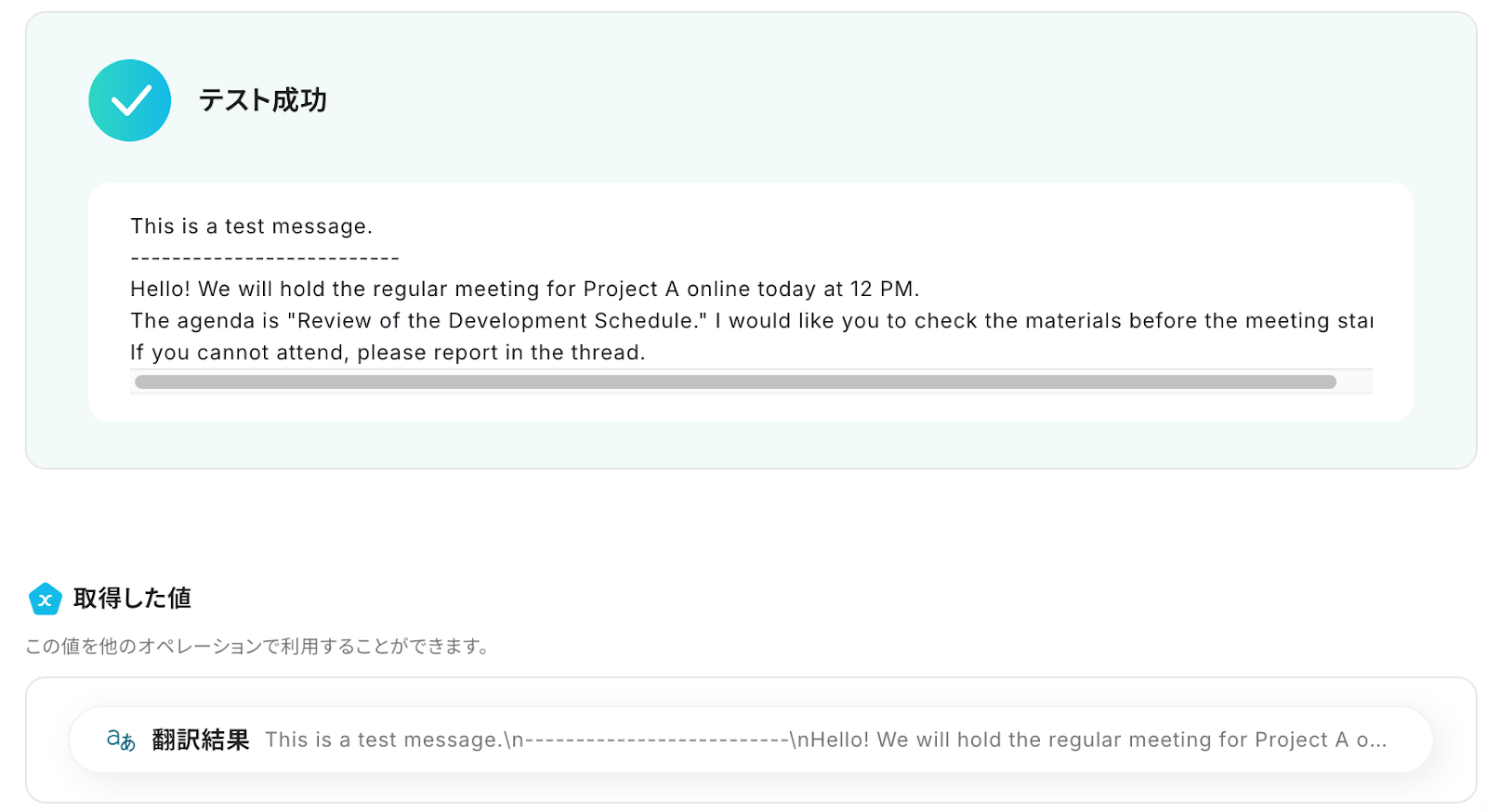 テストに成功し、翻訳された結果が「取得した値」に表示されたら、内容を確認します。