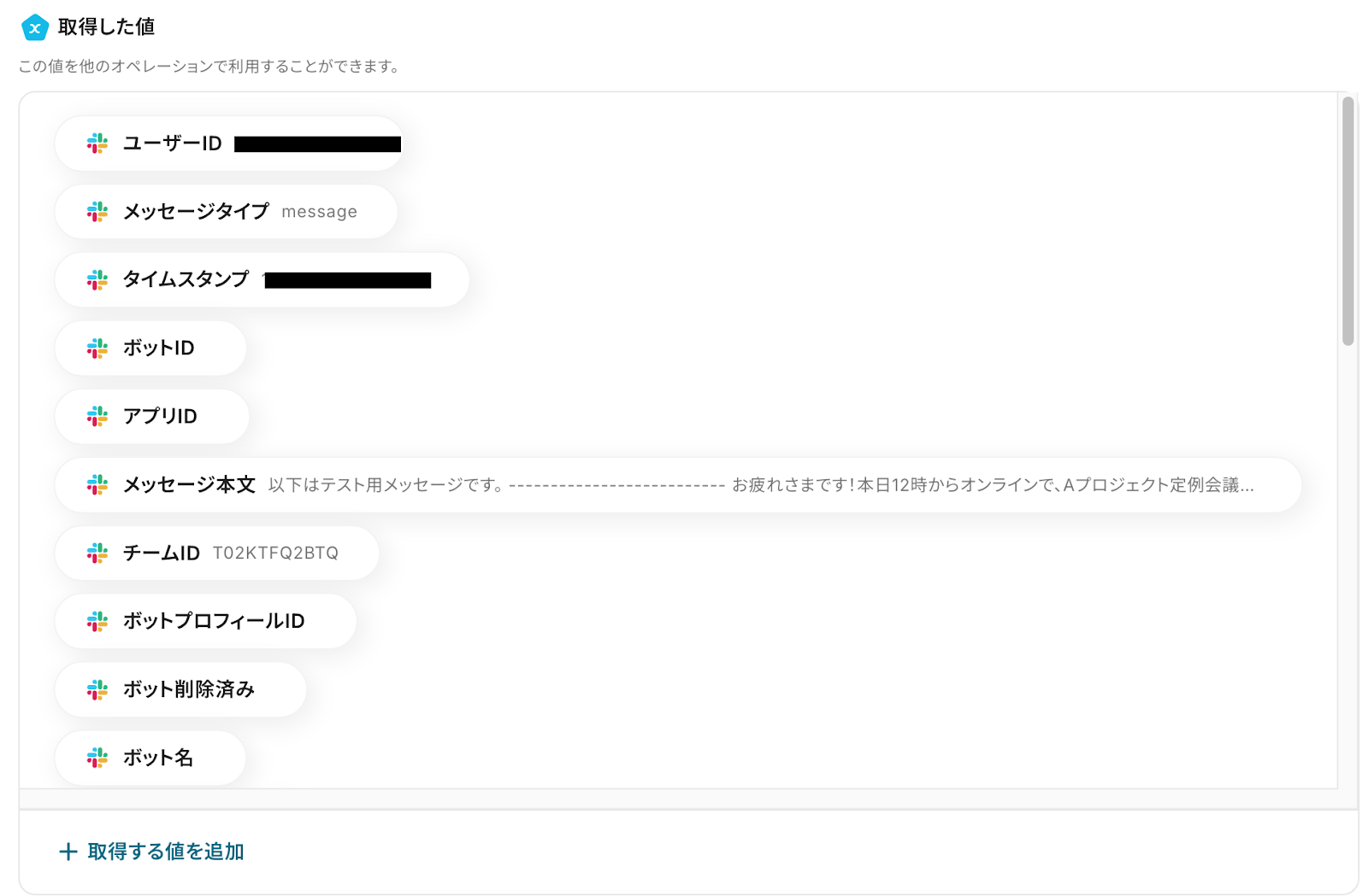 先ほど取得した値(アウトプット)を引用できるので、必要に応じてアウトプットから引用して入力してください。