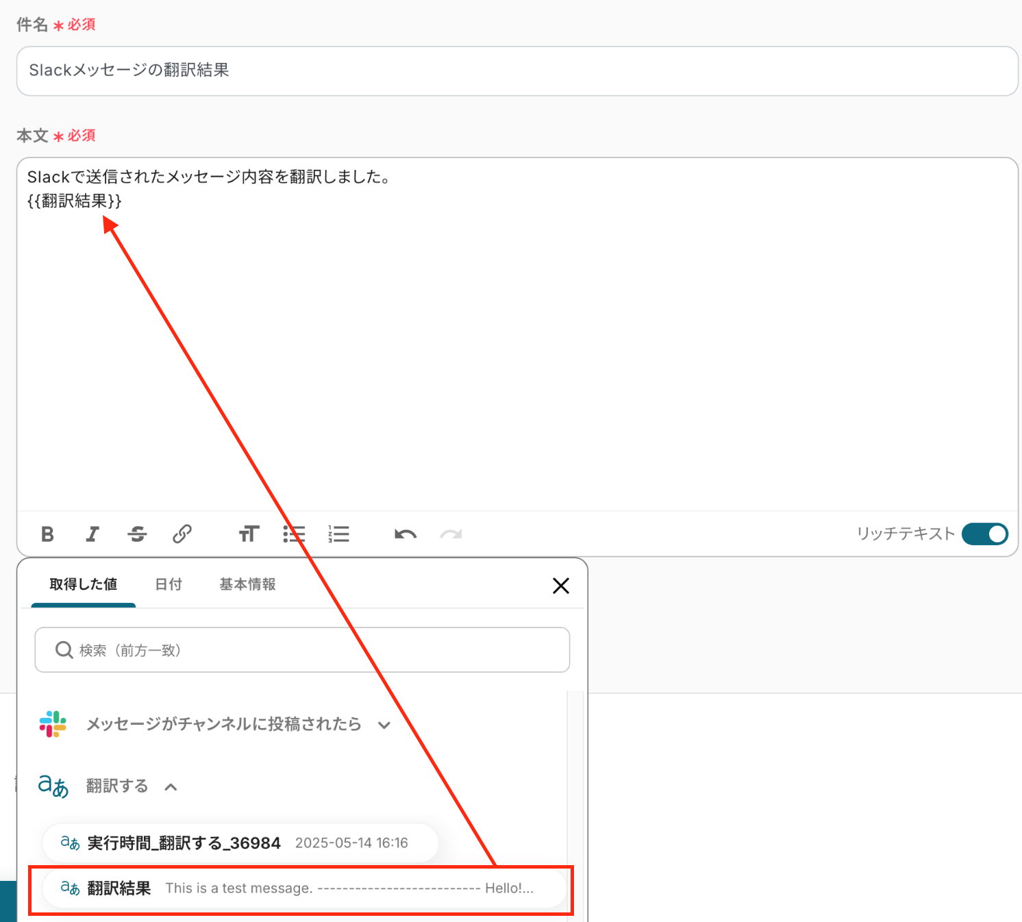 ※以下の画像は、「本文」の項目で、取得した値を活用して作成したものです。