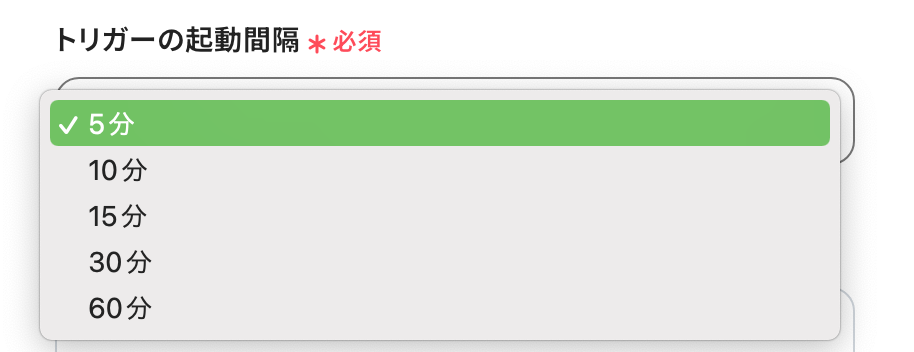 ・トリガーは5分、10分、15分、30分、60分の間隔で起動間隔を選択できます。