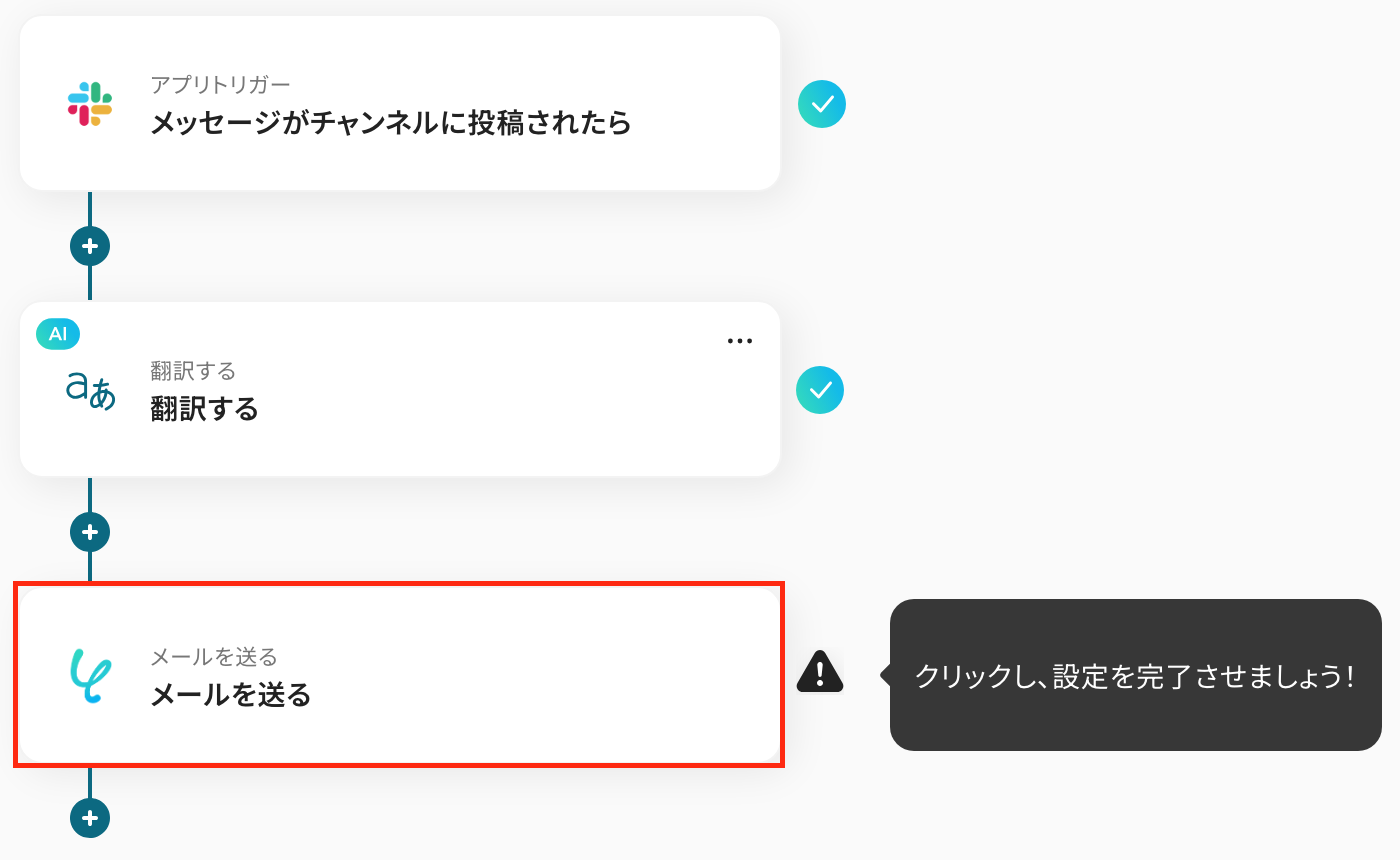 - Slackのトリガー設定と AI翻訳アクションの設定、メール送信アクションの設定