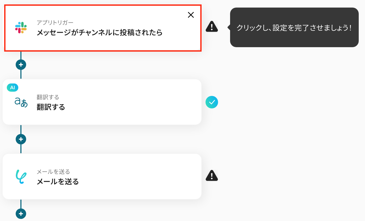 それではここから代表的な例として、Slackの特定チャンネルに投稿されたメッセージをAIが自動で翻訳し、その翻訳結果を指定したメールアドレスに通知するフローを解説していきます!