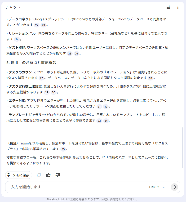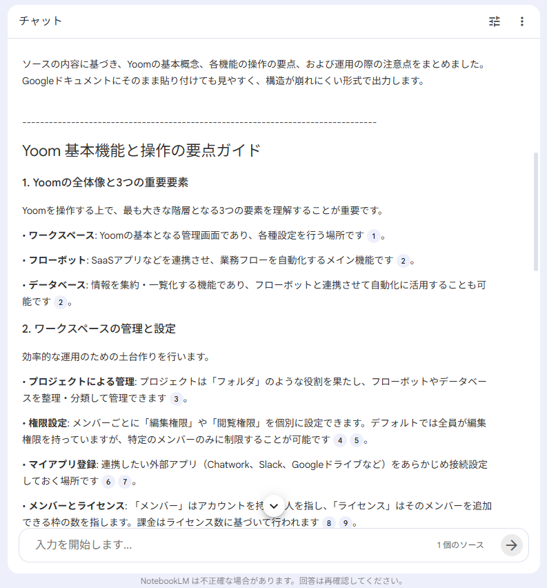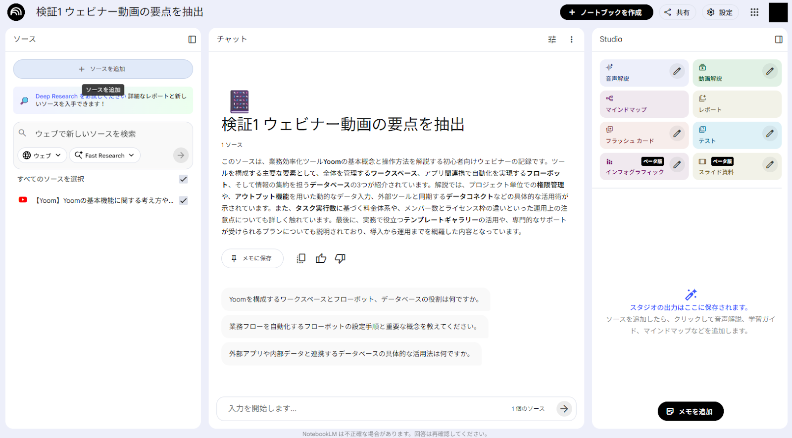 1つ目は、ウェビナー動画の要約です。「【Yoom】Yoomの基本機能に関する考え方や概念について(https://youtu.be/j8nUr0X1JHE?si=o6fIjSaj5lBINEp9)」を読み込ませました。使い方の手順に記載した方法で、ソース追加ボタンからYouTubeのURLを貼り付けるだけで準備は完了となります。