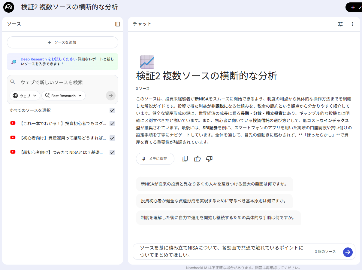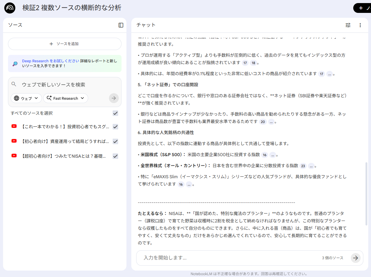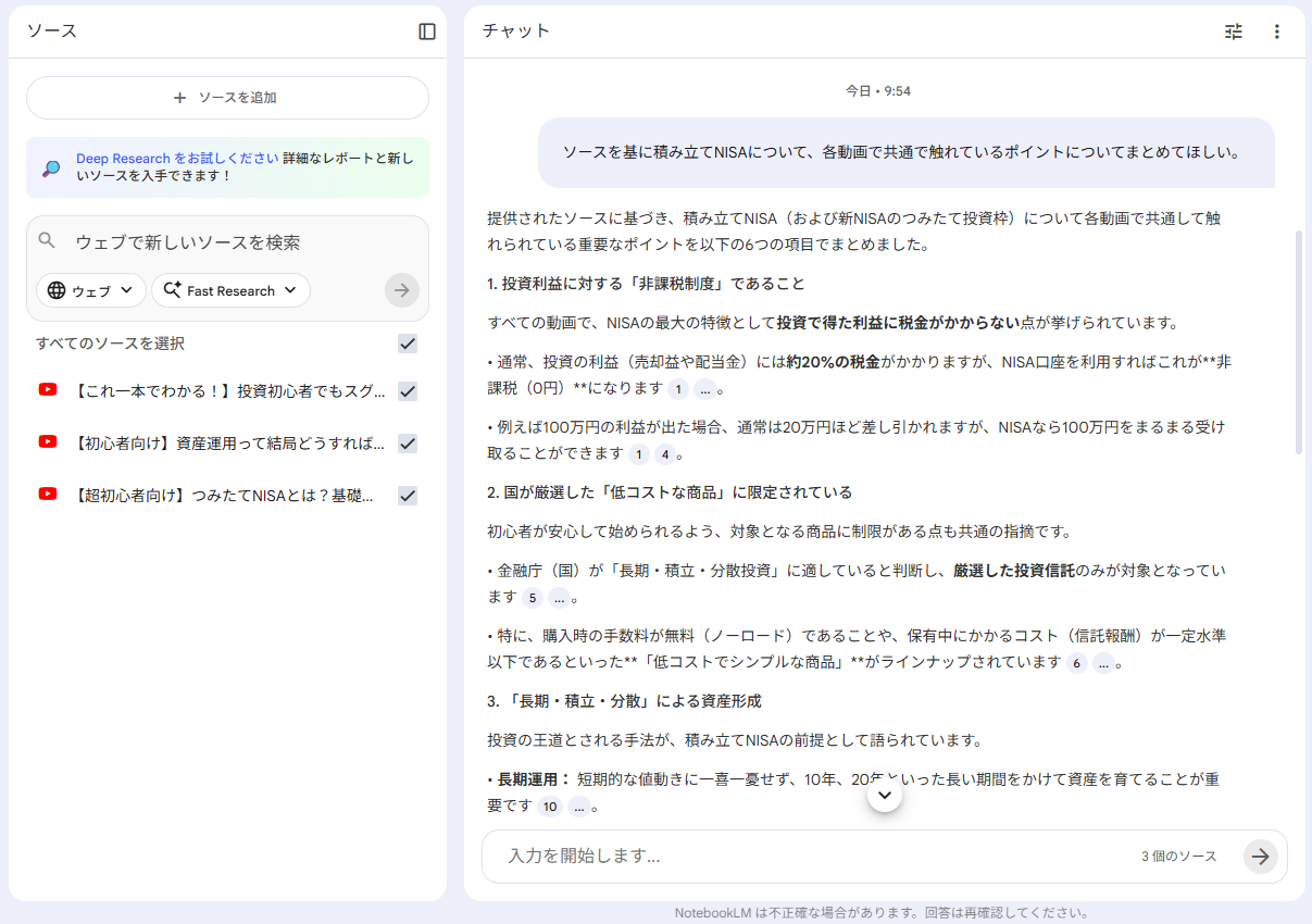 2つ目は、複数ソースにまたがる横断的な分析です。YouTube内で「積み立てNISA 初心者」と検索し、上位に表示された3つの動画URLをすべてNotebookLMに読み込ませて、下記のプロンプトを送信しました。