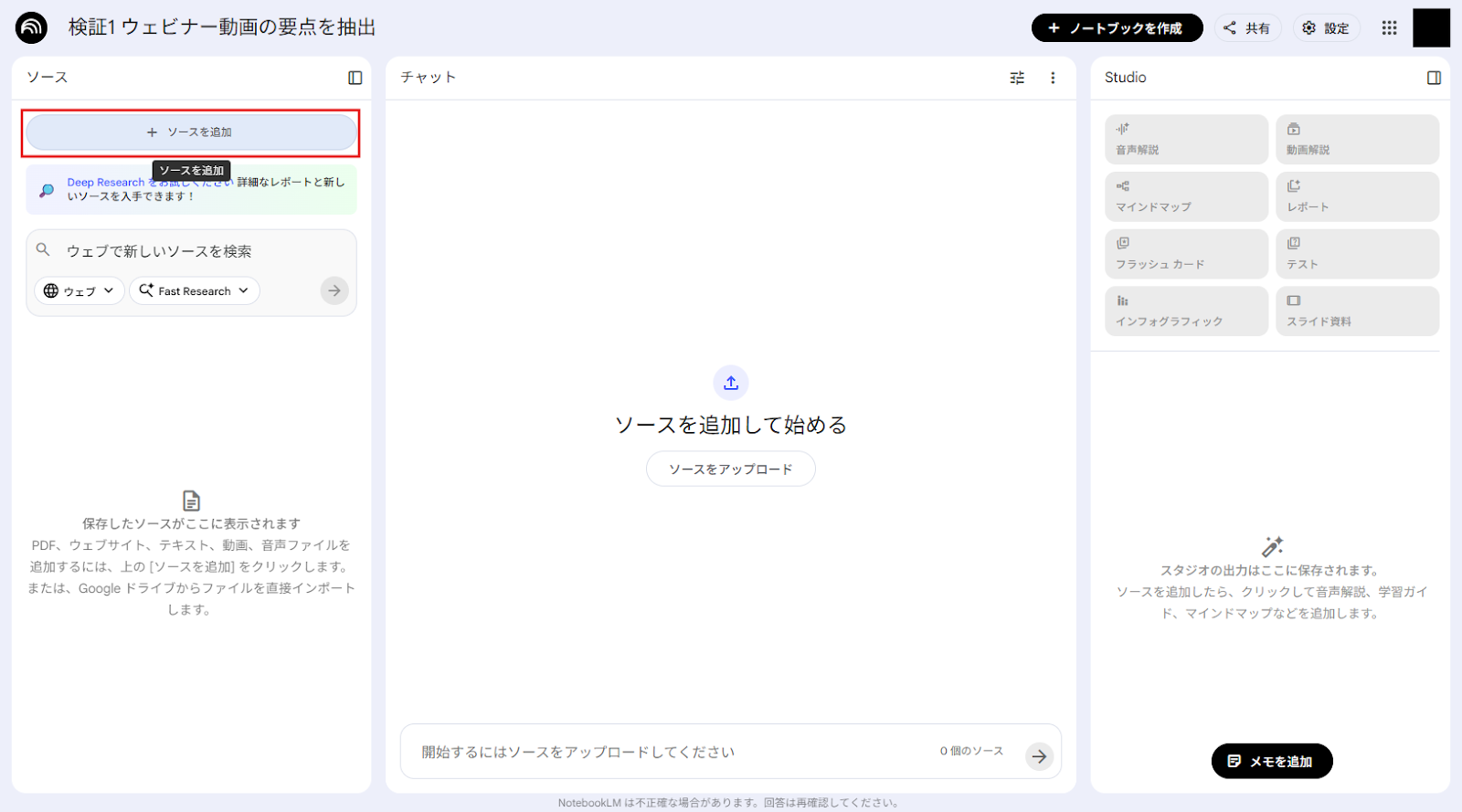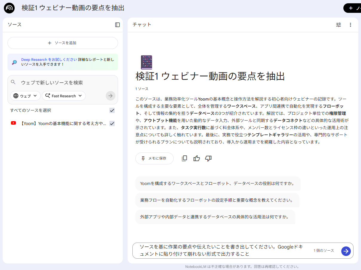 下記のようにソースの追加が完了したら、テキストを入力し動画の要約や解説などの指示を出していきましょう。