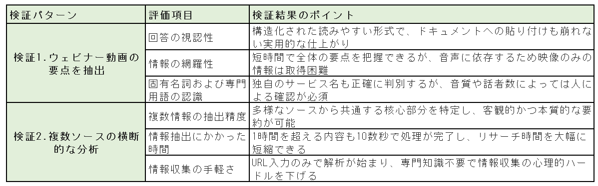 分析に要した時間はわずか12秒ほどでした。動画1本を対象とした検証1の9秒と比較すると、ソースの量に応じて多少の変動はあるようですが、それでも合計で<span class="mark-yellow">1時間を超える3本の動画の内容を10数秒で集約できる点</span>はかなり効率的であるといえます。自己学習や市場リサーチなど、膨大なインプットを必要とする場面において、情報収集のプロセスを大幅に短縮できるスピードであると評価できます。