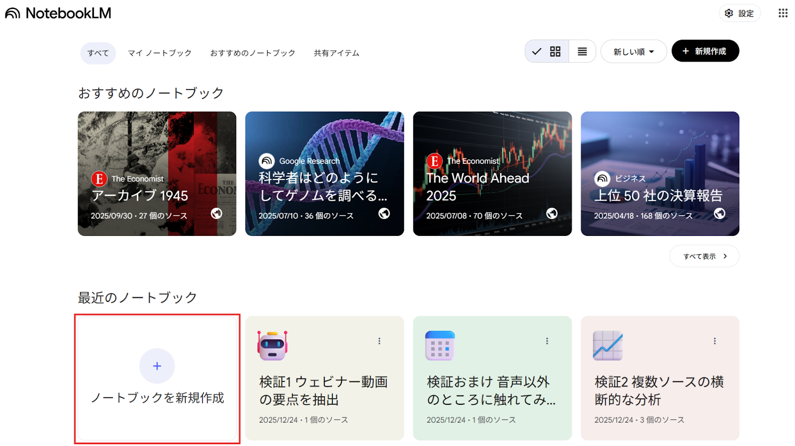 NotebookLM(https://notebooklm.google.com/)にログインし、新しいノートブックを作成しましょう。