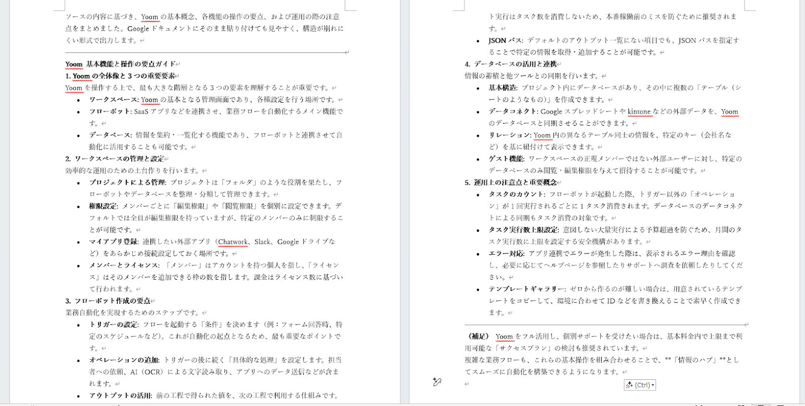 出力された内容は適切な見出しによって構造化されており、非常に読みやすい形式となっています。また、プロンプトに「Googleドキュメントに貼り付けて崩れない形式で出力すること」と記載した通り、実際にGoogleドキュメントへコピー&ペーストを行った際も書式が崩れなかったことから、<span class="mark-yellow">体裁を整える手間をかけずにそのまま議事録やレポートの下書きとして活用できる実用性</span>を備えていると評価できます。
