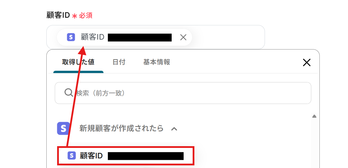 顧客ID:元から設定されています。入力欄をクリックすると、以下のように顧客IDを引用できます。