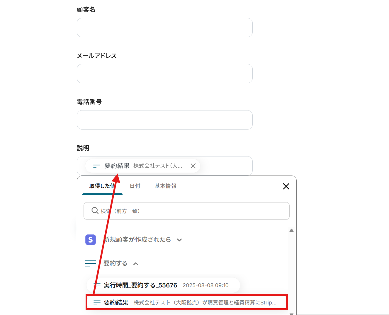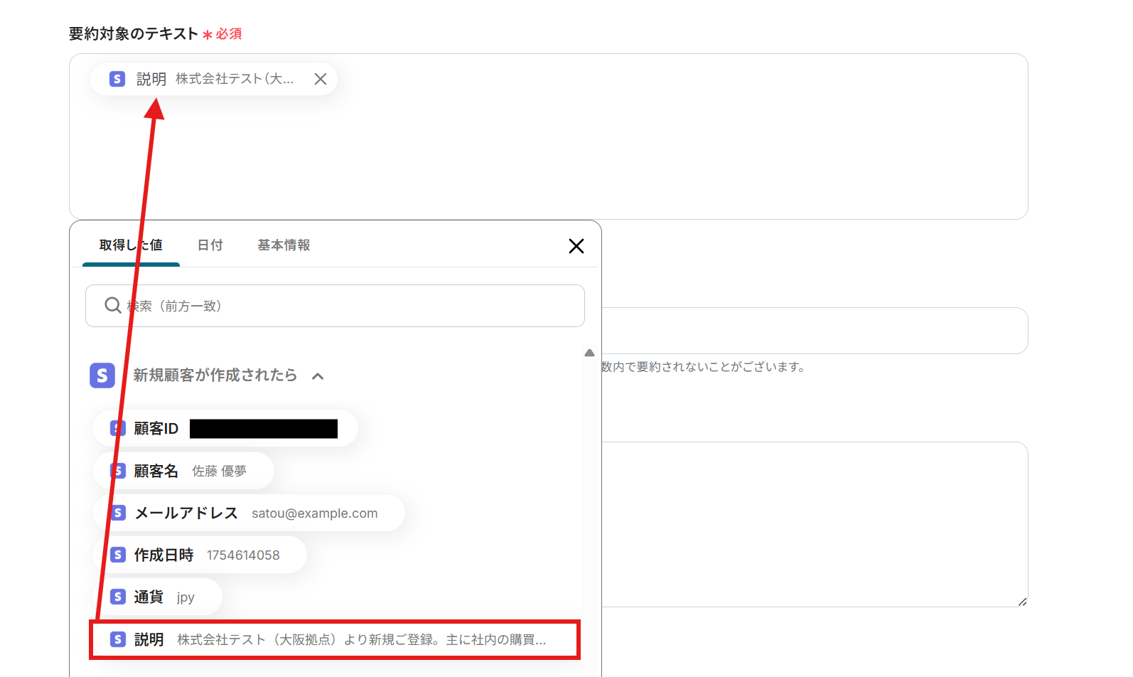 要約対象のテキスト:元から設定されています。編集欄をクリックすると以下のようにStripeから取得した値を引用できます。取得した値を活用することで、手入力による転記ミスを防げます。