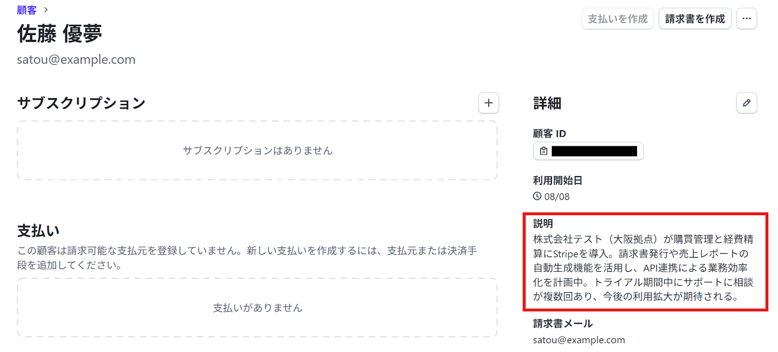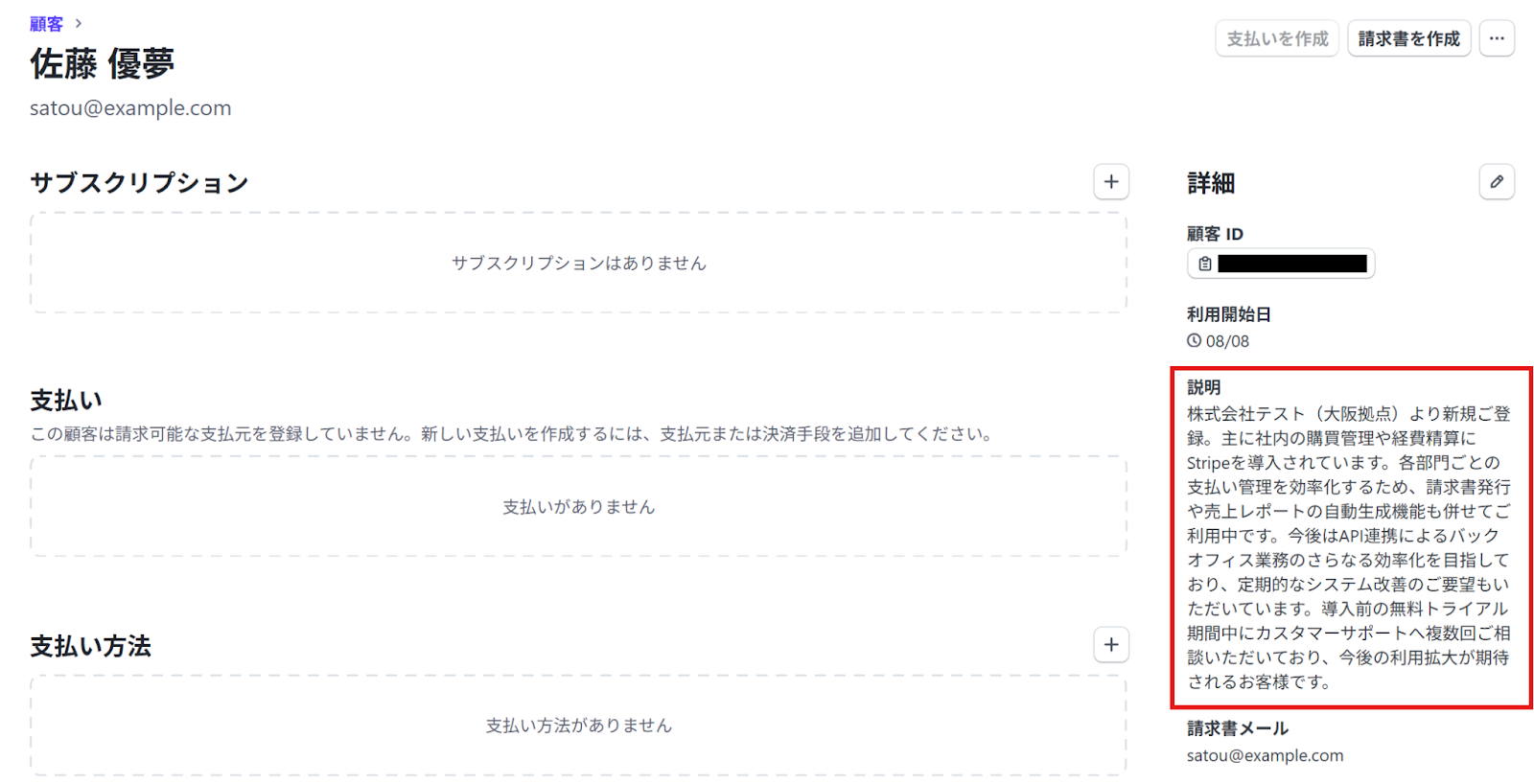 「Stripeに新しい顧客を作成する際、説明欄に要約した内容を入力する作業に時間を取られていませんか?」