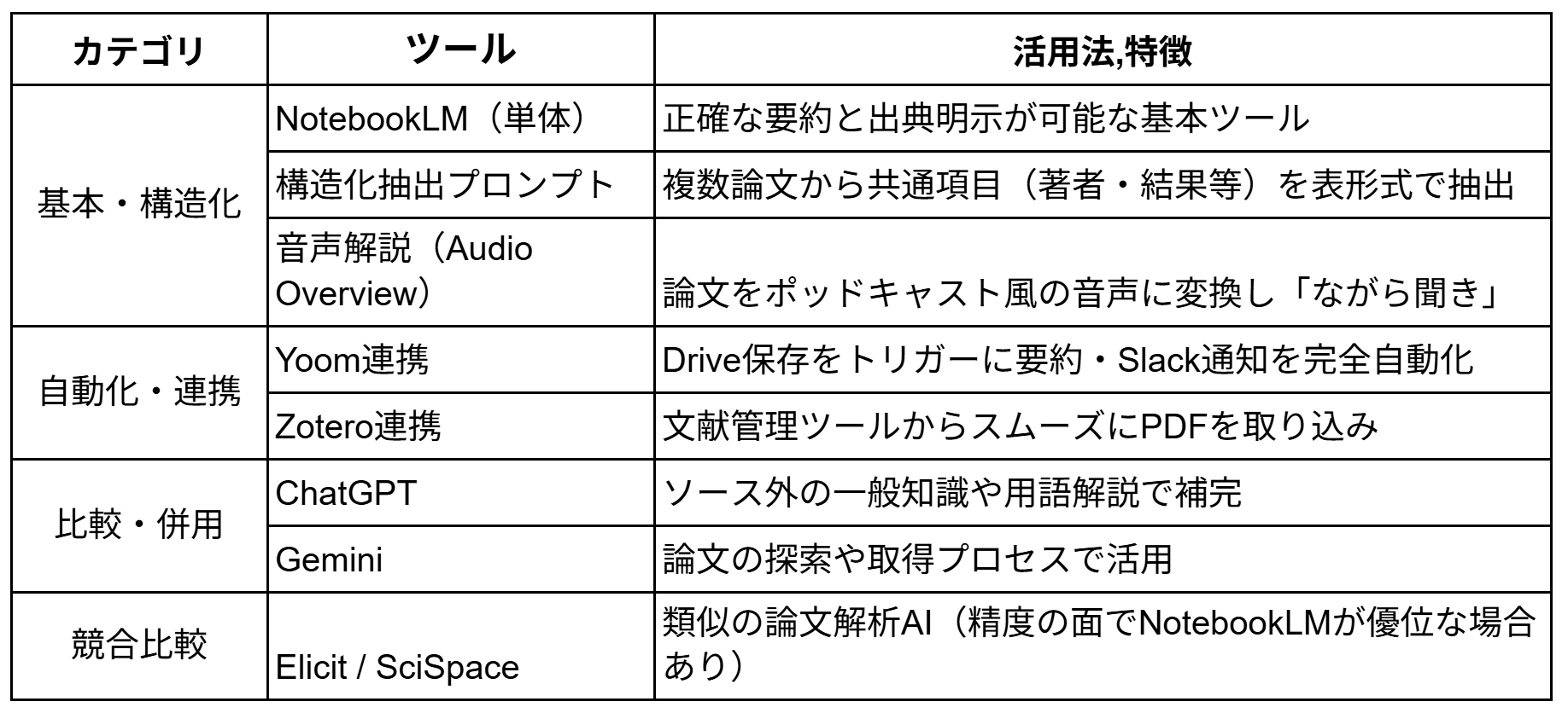 NotebookLMを使いこなすための主要な活用パターンと、併用すべきツールをカテゴリ別に整理しました。