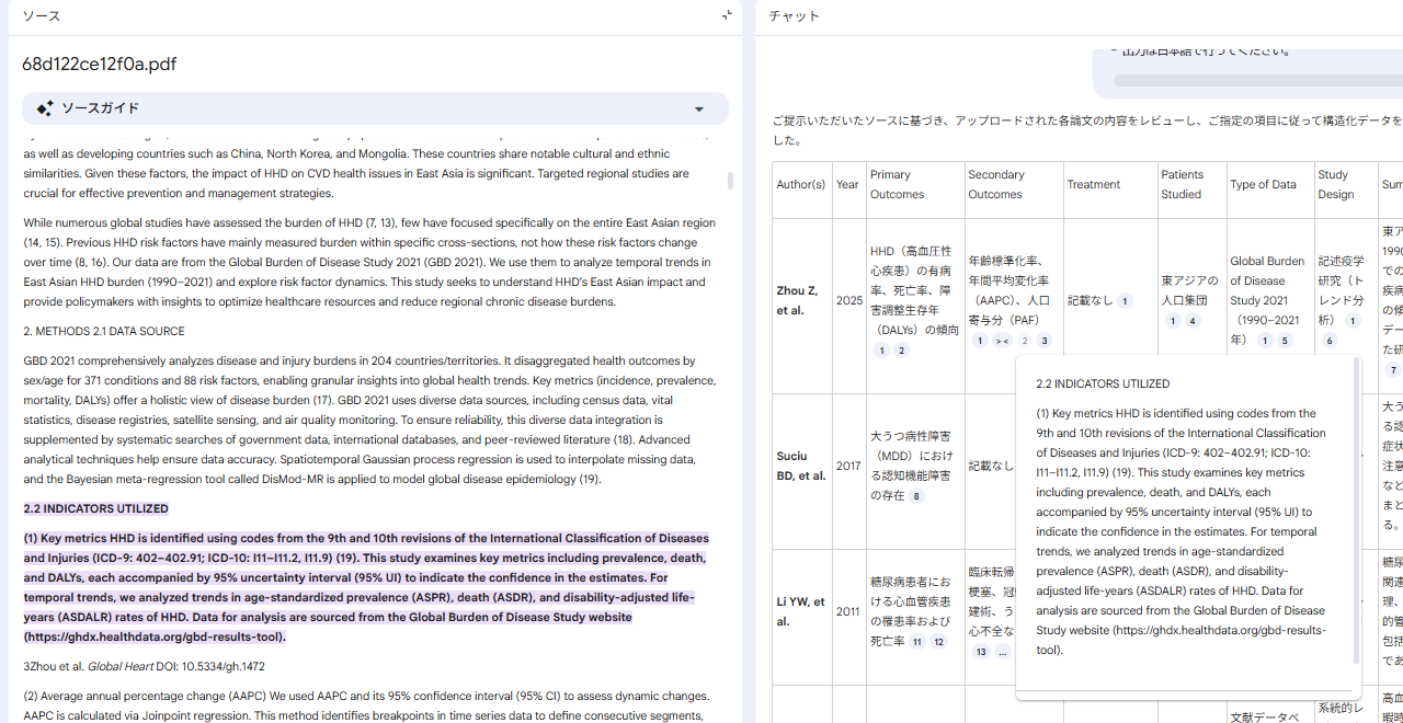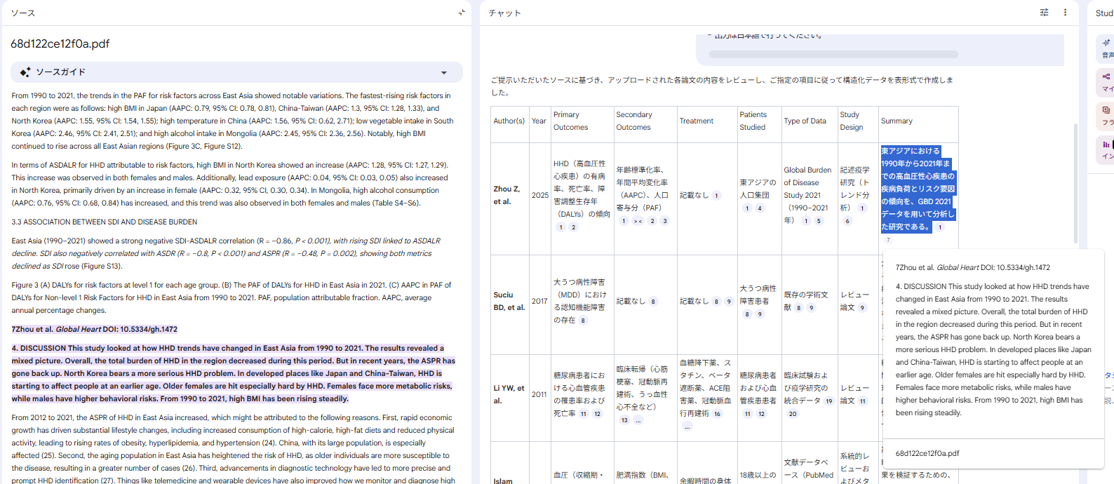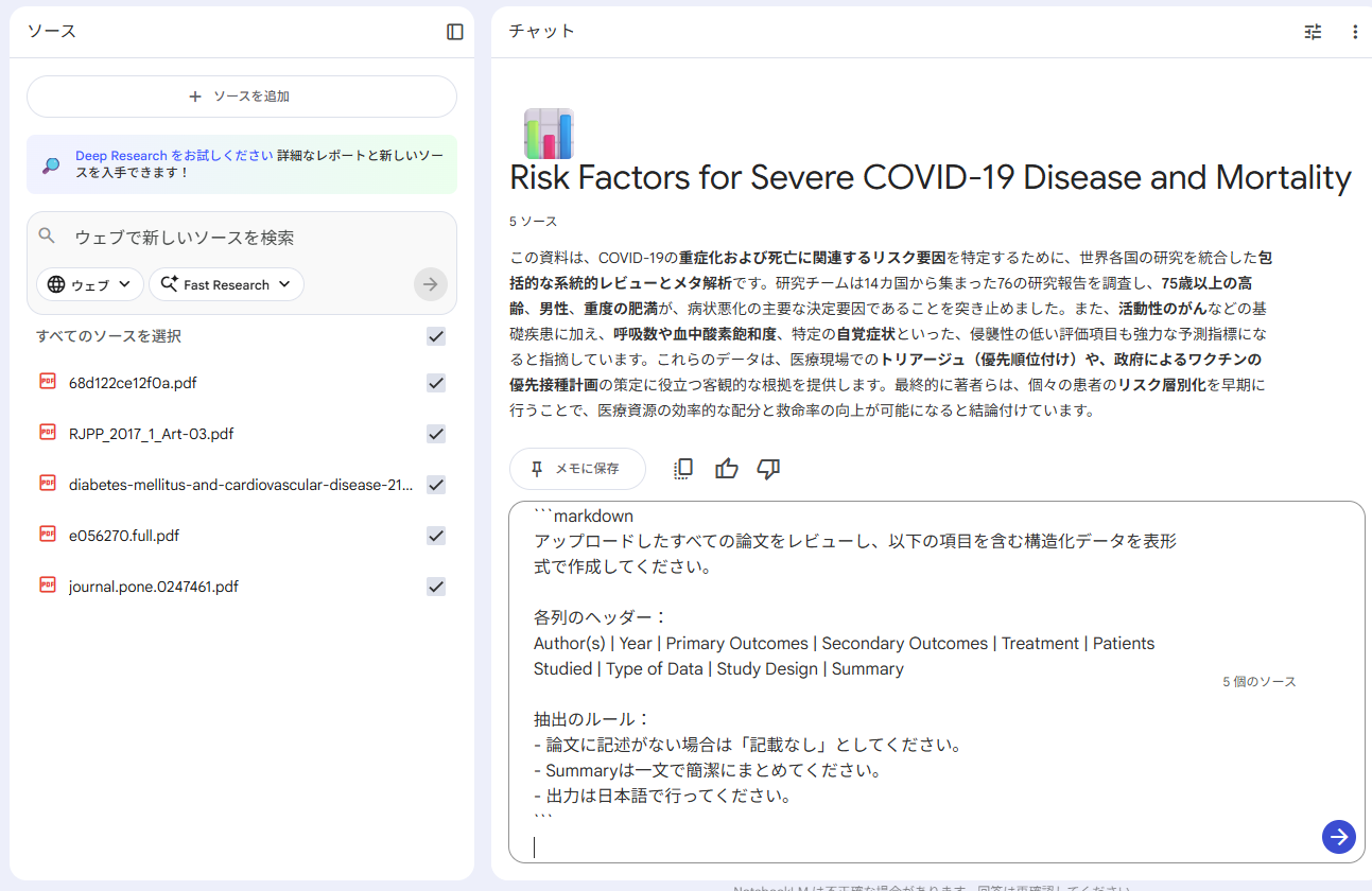 - 「Primary outcomes」「Study design」などを指定して表を作らせると、数時間かかっていたシステマティックレビューの下準備が一瞬で終わります。ElicitやSciSpaceと比較した個人的な検証では、PDFを指定して読み込ませる用途においてNotebookLMが使いやすいと感じました。