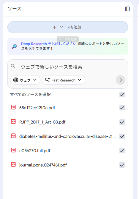 それぞれオープンアクセスのPDFです。ダウンロードをしてNotebookLM にソースとして追加しましょう。