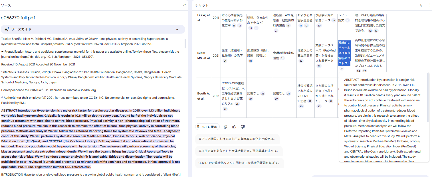 原文で明示されている 研究目的(高血圧管理における余暇時間の身体活動の効果検証)、対象(18歳以上の高血圧患者)、介入内容(leisure-time physical activity)、研究デザイン(systematic review and meta-analysis protocol) は、NotebookLMの表内でも正確に反映されており、英語論文の要点が日本語で適切に構造化されていることが確認できました。