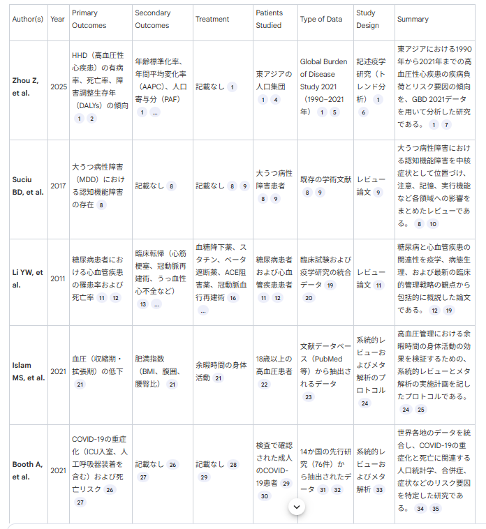 1 | 複数論文の横断レビューと比較表作成 | 特定の治療法に関する5本の論文から、患者数・結果・副作用などを一覧表にする。