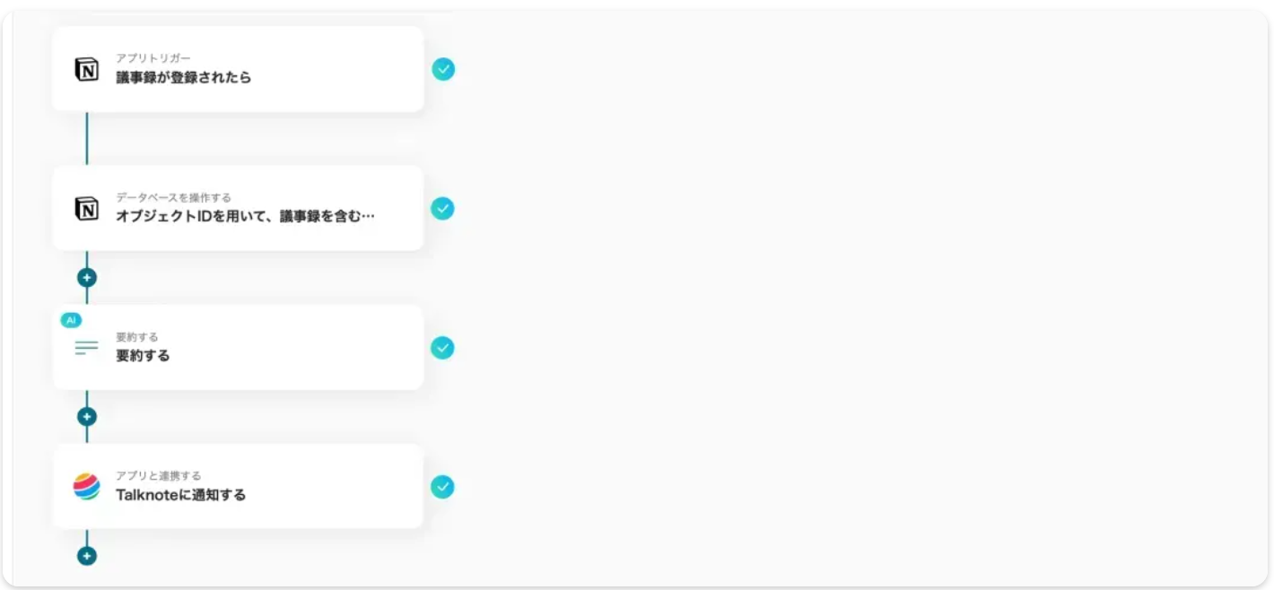 今回はこのようなお悩みポイントに着目し、Notionで管理や編集をしている議事録が新たに追加されたら自動で要約し、Talknoteに通知するというフローを自動化するアプリ連携について紹介していきます!