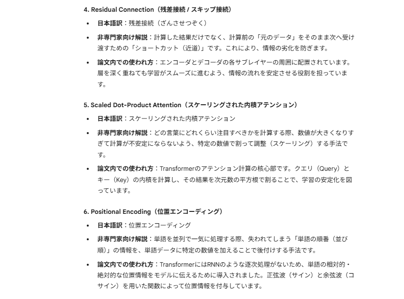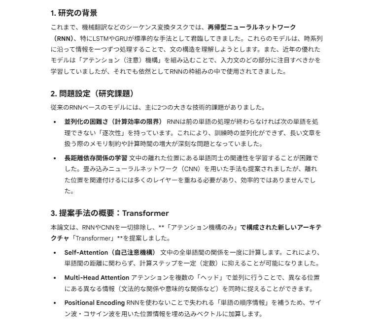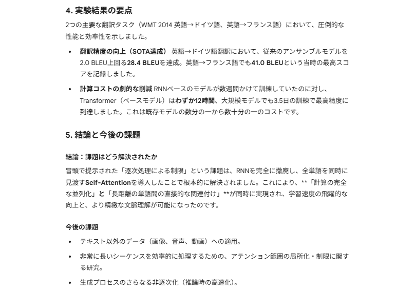 各章の断片的な要約に留まらず、前後のセクションが持つ論理的な因果関係(例:RNNを排除したからこそ位置エンコーディングが必要になった等)を保持したまま出力されており、高度なコンテキスト理解能力が示されました。