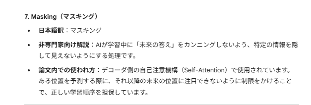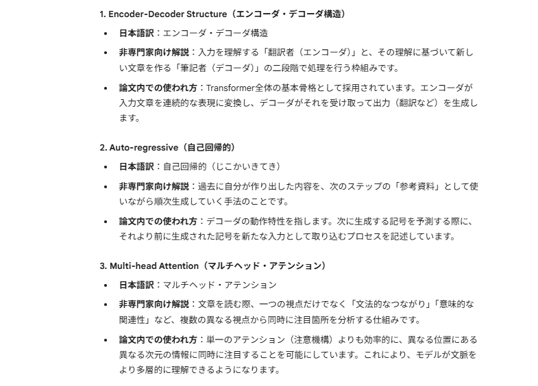 例えば、"Auto-regressive"を「自己回帰的」、"Residual Connection"を「残差接続」と訳すなど、学会や技術コミュニティで一般的に使用される用語を逸脱することなく採用しています。さらに、単なる言葉の置き換えに留まらず、各用語がTransformerというアーキテクチャ内で果たしている機能的な役割(例:Maskingが未来の情報を隠蔽し学習順序を担保する点など)を正しく解釈できています。クエリ、キー、バリューの関係性といった抽象的な数理モデルの本質を、論文の文脈に即して的確に捉えており、技術的な信頼性がかなり高いと評価できます。