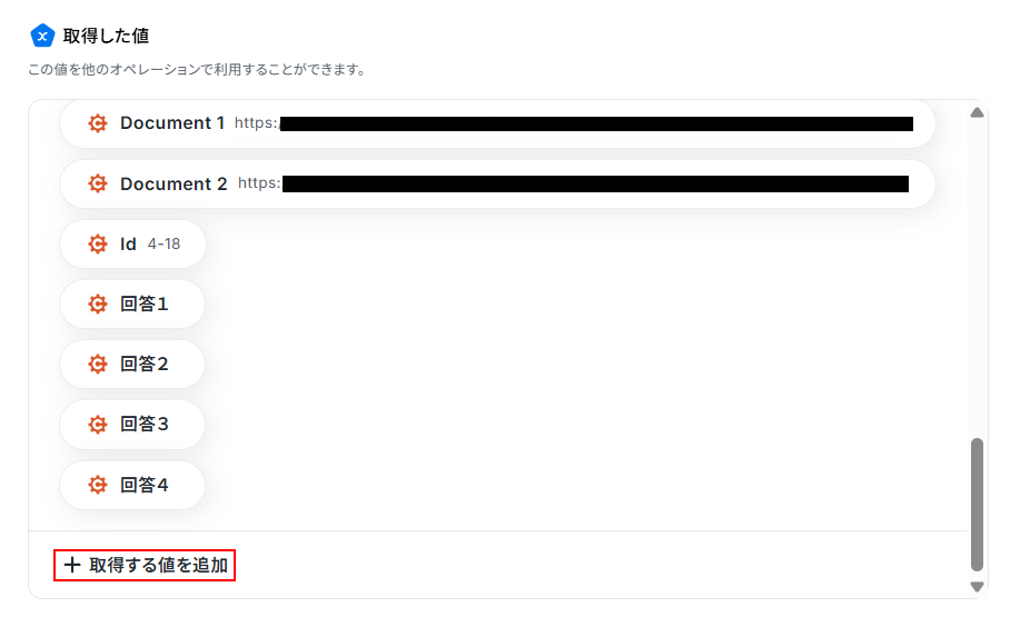 今回使用するCognito Formsは自由に回答を得られるため、特定の取得した値が設定されていません。 そのため、利用したい値が取得した値の項目内に表示されていない場合は値を追加してください。