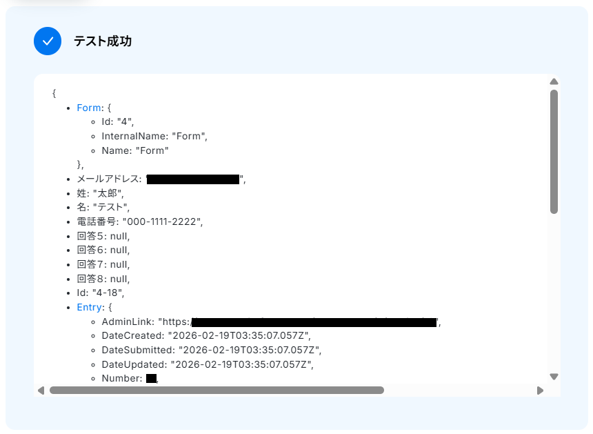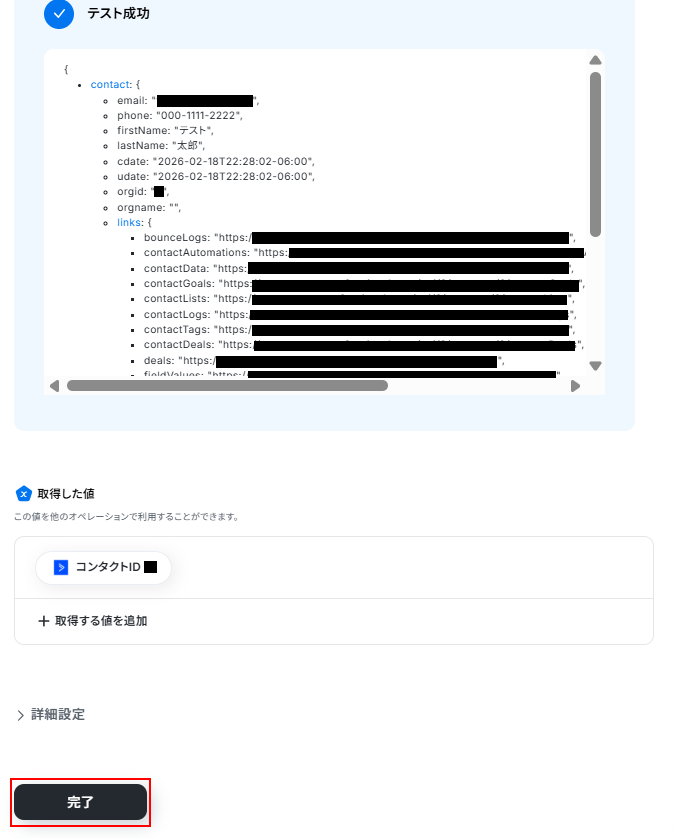 テストに成功すると、テスト成功画面と取得した値が表示されますのでご確認ください。 確認できたら完了 をクリックしましょう。
