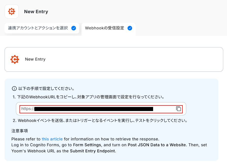 ここまで設定できたら、先ほどWebhookURLを登録したフォームから実際にテスト用データを送信しましょう。 今回ご紹介するテンプレートは、Cognito FormsでNew Entryを検知したら起動します。 そのため、実際にテストを行うにはCognito Formsで回答を送信してください。