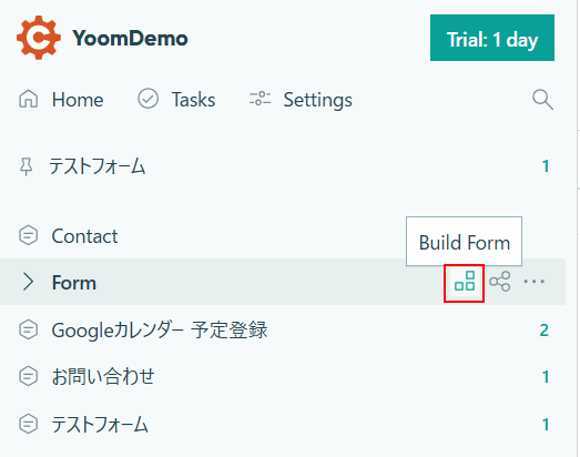 Cognito Formsの画面に移動し、利用したいフォームのBuild Formをクリックします。