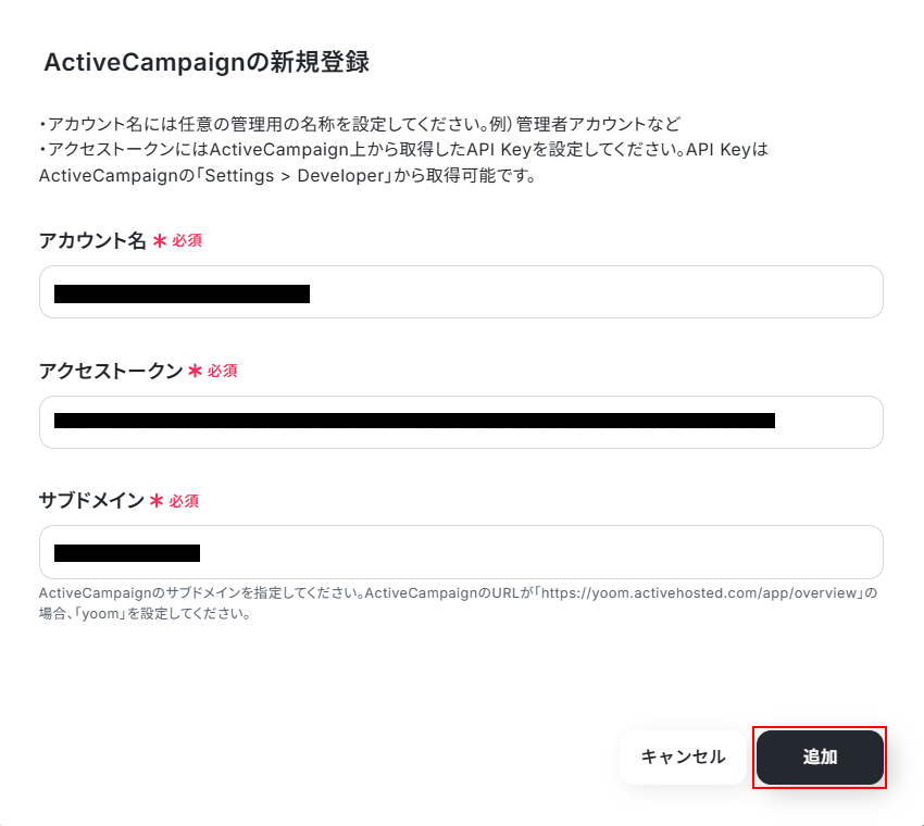 表示内容を確認し、アカウント名、アクセストークン、サブドメインを設定します。 設定できたら追加 をクリックしましょう。