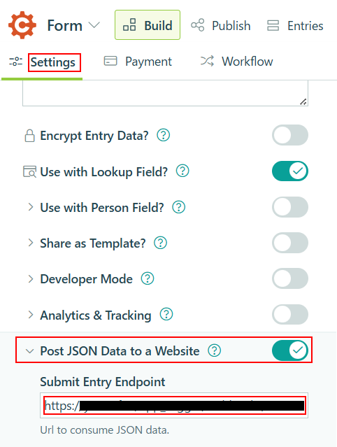 Settingsタブの中にある、Post JSON Data to a Website の項目をON にします。 次に、左端にある>をクリックしてメニューを開いたら、Submit Entry Endpoint の箇所に先ほどコピーしたWebhookURLをペーストしましょう。