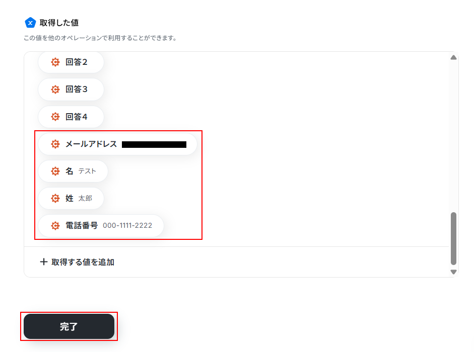 取得した値の項目内に追加した値が表示されているのを確認できたら、忘れずに完了 をクリックしましょう。